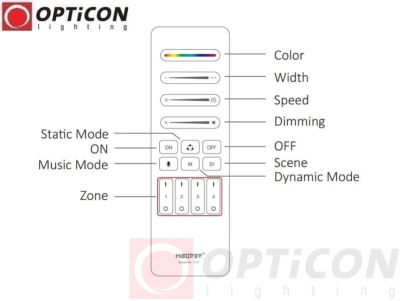 - Pilot pozwala na zaprogramowanie jedną strefę oświetlenia. Każda strefa oświetlenia powstaje poprzez przypisanie do pilota dedykowanego sterownika Mi-Light. Ponadto pilot pozwala na przypisanie do każdej strefy, dowolną ilość sterowników. Sterując oświetleniem, można sterować każdą strefą osobno lub wszystkimi strefami jednocześnie.