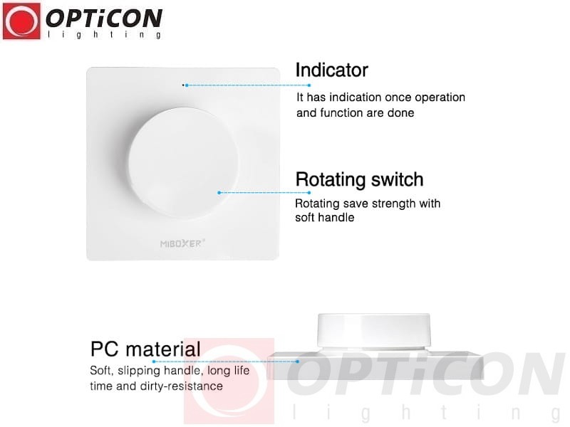 Pilot radiowy dedykowany do sterowania produktami firmy Milight / Miboxer. Może być stosowany do sterowania sterownikami taśm LED oraz przełącznikami elektrycznymi 230V AC.