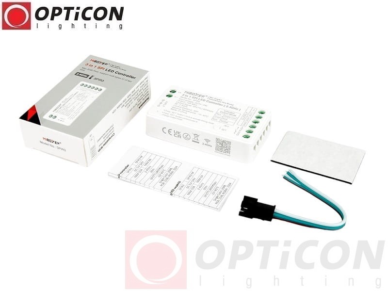 Sterownik Cyfrowych Taśm LED MiLight SPIR3 3in1 przeznaczony jest do sterowania oświetleniem wykonanym z cyfrowych taśm lub modułów led. Sterowanie odbywa się za pomocą pilotów, włączników lub paneli naściennych. Kontroler przeznaczony jest do zasilania napięciem 5V, 12V lub 24V DC. Instaluje się go pomiędzy zasilaczem a oświetleniem LED.