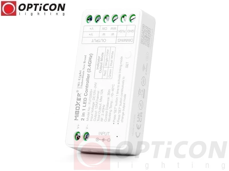 Sterownik Taśm LED MiLight FUT035S+ 2in1 przeznaczony jest do sterowania jedno i dwukolorowym oświetleniem wykonanym z taśm lub modułów led. Sterowanie odbywa się za pomocą pilotów, włączników lub paneli naściennych. Kontroler przeznaczony jest do zasilania napięciem 12V lub 24V DC. Instaluje się go pomiędzy zasilaczem a oświetleniem LED.