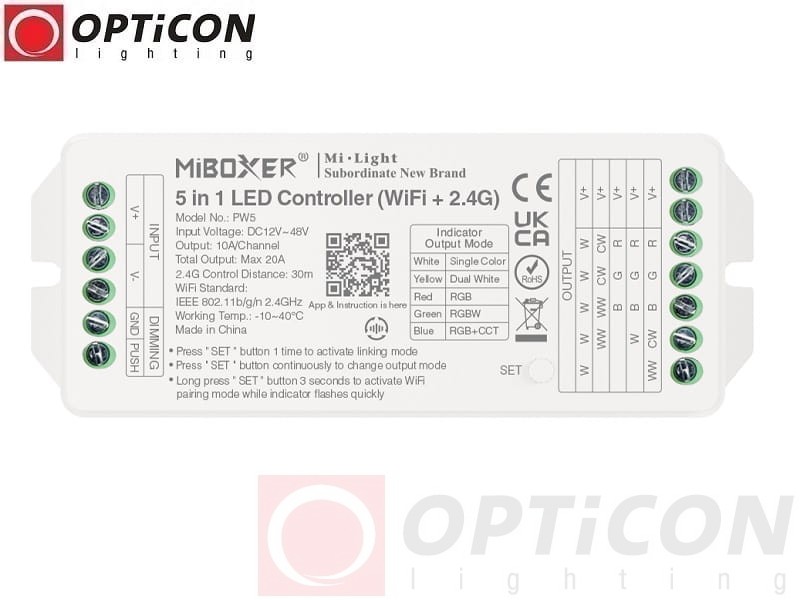 Sterownik Taśm LED MiLight PW5 przeznaczony jest do sterowania oświetleniem wykonanym z taśm lub modułów led. Sterowanie odbywa się za pomocą aplikacji, pilotów, włączników lub paneli naściennych. Kontroler przeznaczony jest do zasilania napięciem 12V lub 24V DC. Instaluje się go pomiędzy zasilaczem a oświetleniem LED.