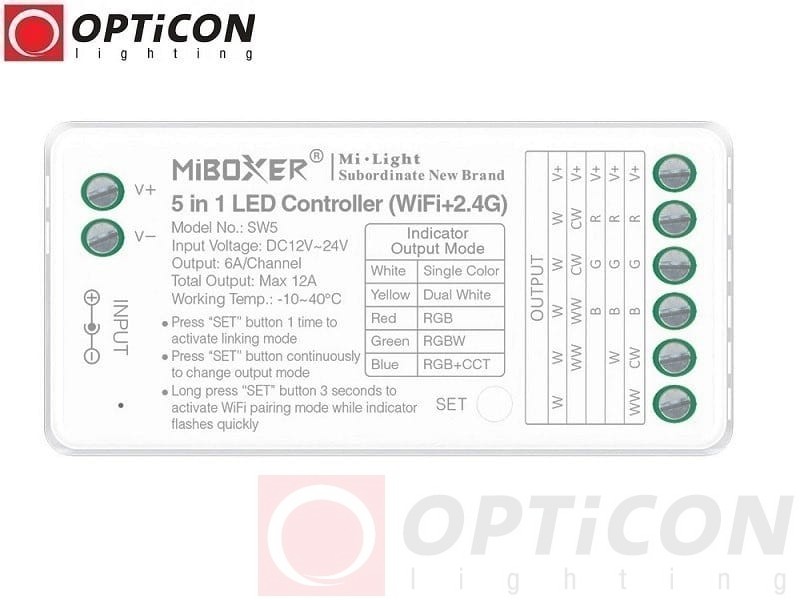 Sterownik Taśm LED MiLight SW5 przeznaczony jest do sterowania oświetleniem wykonanym z taśm lub modułów led. Sterowanie odbywa się za pomocą aplikacji, pilotów, włączników lub paneli naściennych. Kontroler przeznaczony jest do zasilania napięciem 12V lub 24V DC. Instaluje się go pomiędzy zasilaczem a oświetleniem LED.